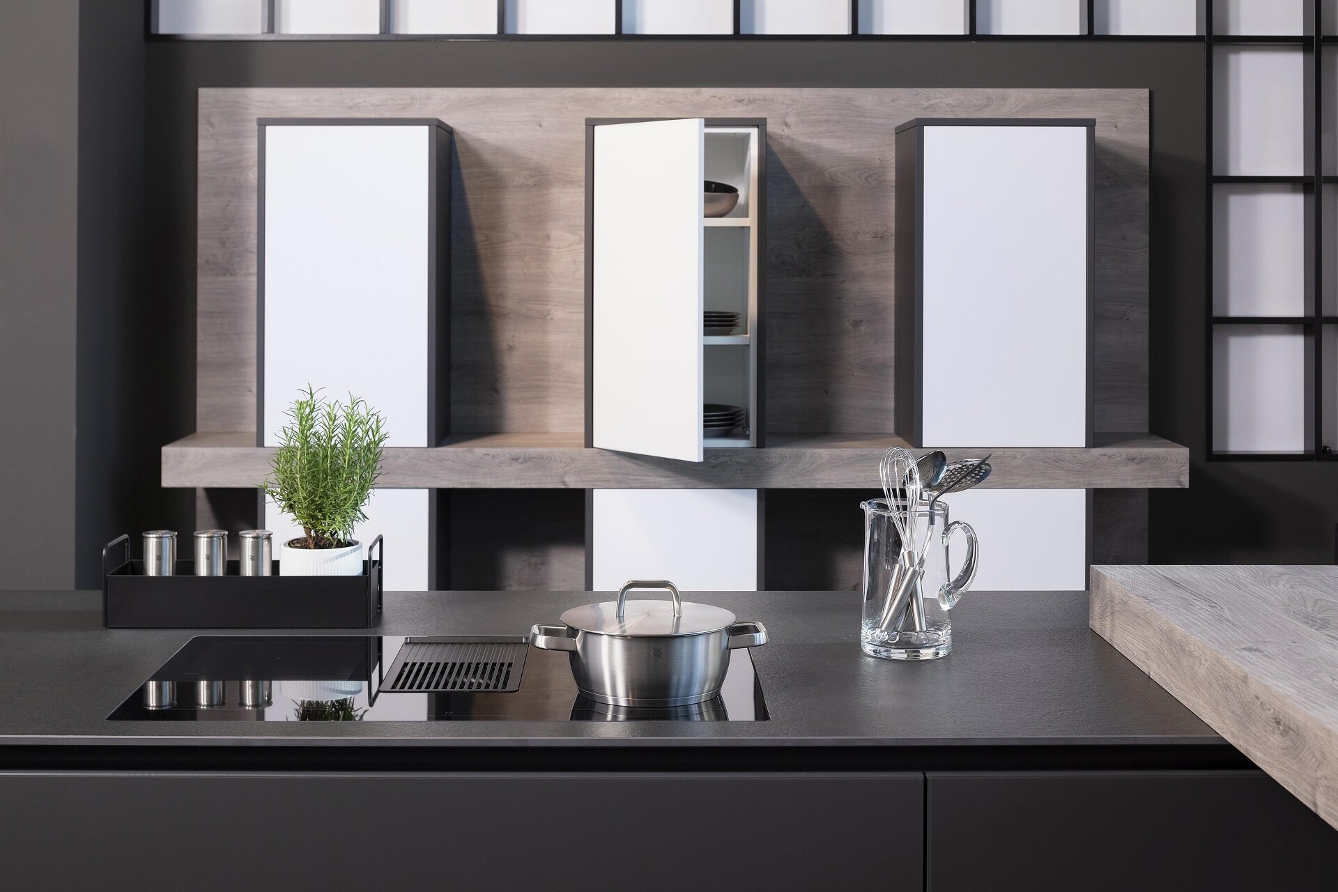 Eine kubistische Gestaltung prägt diese Komposition aus symmetrisch gehängten grifflosen Küchenschränken, die sich auf Antippen öffnen. Die sechs weißen Hängeschränke wirken vor der auf Schwarz aufliegenden Holzrückwand wie drei skulpturale Designobjekte, umrahmt von Regalfachreihen im japanischen Shoji-Style. Stauraumschaffung steht für Liebhaber solchen Küchendesigns nicht im Vordergrund. Hier geht es um puristische Ästhetik in einer auf das Wesentliche reduzierten Formensprache.