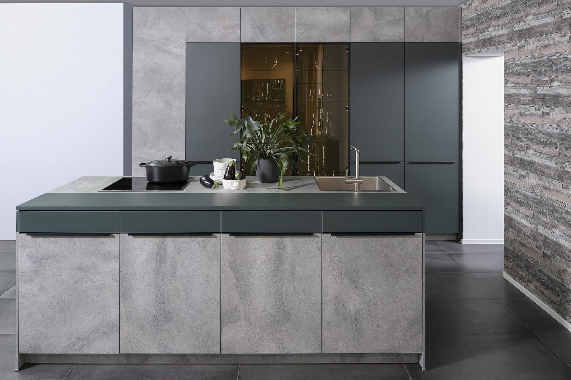 Auf der Suche nach einem besonderen Farbton für Ihre neue Küche – mit allem anderen als Allerweltsfarbe? – Unser Küchenbeispiel zeigt, welche eleganten Grün-Töne es gibt, gerade wenn sie mit Schwarz- oder Grauanteilen versehen wurden. Entsprechend lässt sich Blackgreen perfekt mit Grautönen kombinieren. Generell machen Grüntöne sich aber auch klasse zusammen mit Goldelementen, z.B. in Form von Beschlägen oder Lampenschirmen.